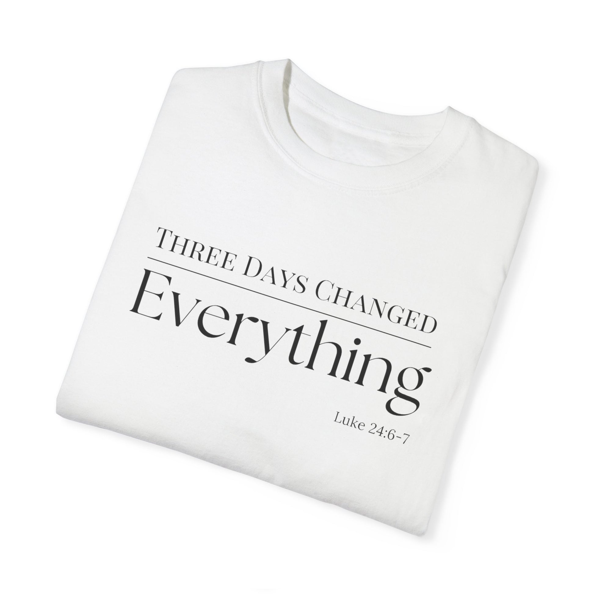 Three Days Changed Everything Christian T-Shirt – Luke 24:6-7 | Easter Faith-Based Apparel