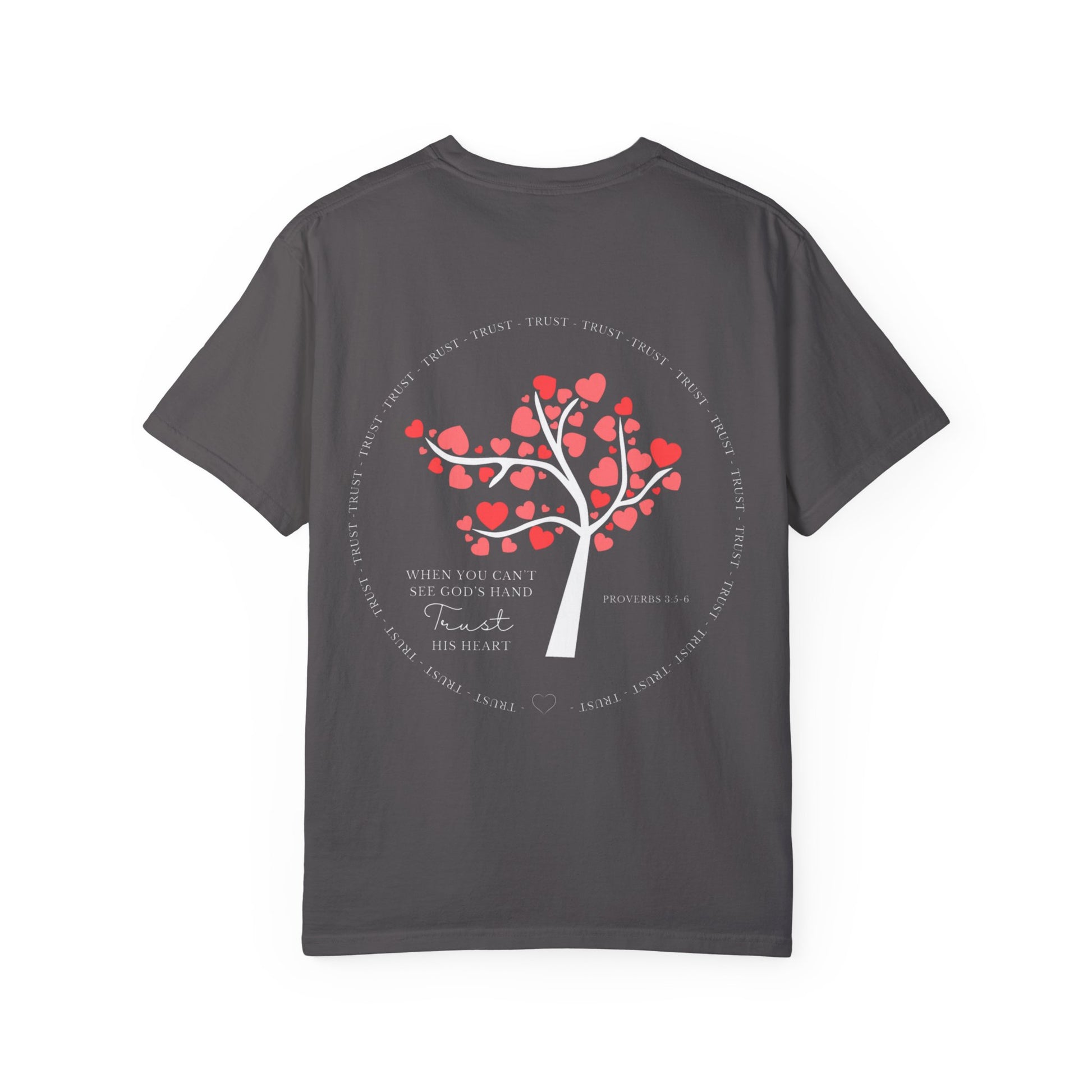 Find strength in faith with our Trust His Heart Christian t-shirt, inspired by Proverbs 3:5-6. This premium unisex tee is a beautiful reminder to trust in God’s plan, even when you can’t see His hand. Designed with an elegant front text and a stunning heart-tree graphic on the back, this Christian apparel is perfect for sharing your faith with the world.